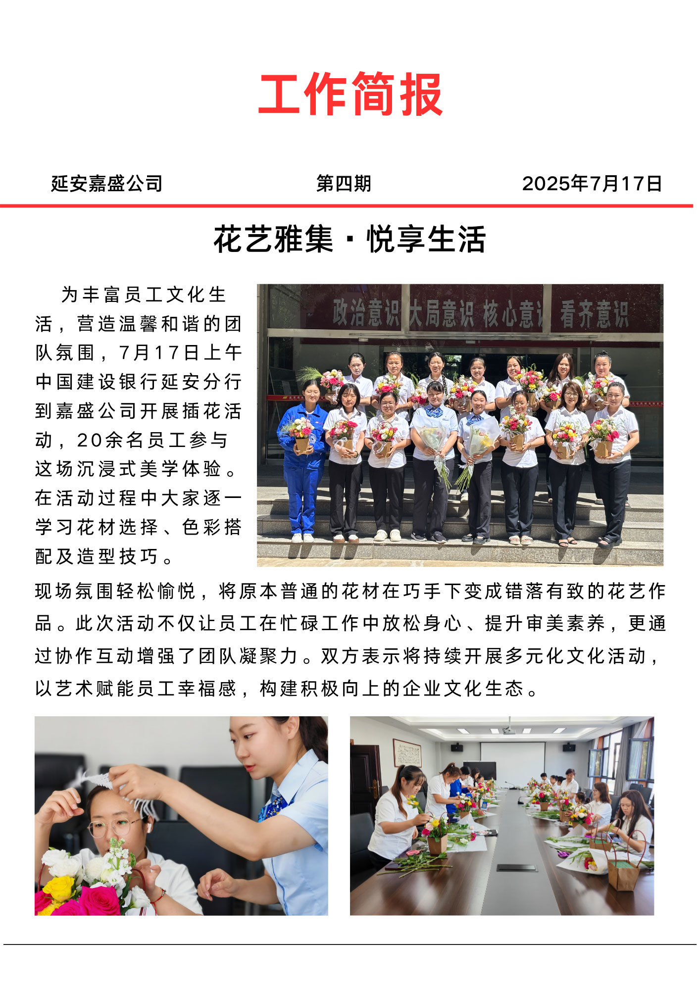 为丰富员工文化 生活,营造温馨和谐的团队氛围,7月17日上午中国建设银行延安分行到嘉盛公司开展插 花 活动,20余名员工参与这场沉浸式美学体验。