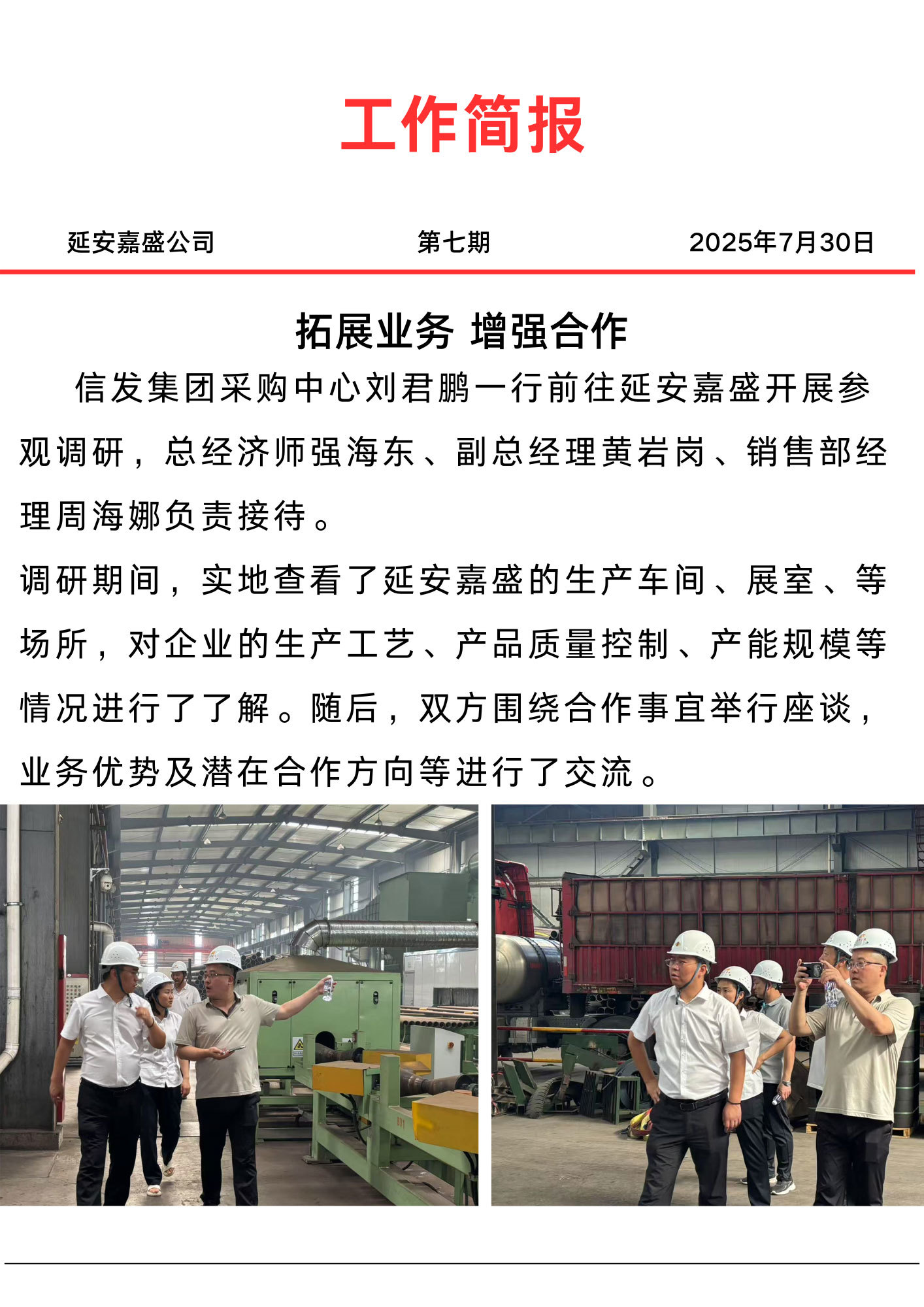 信发集团采购中心刘君鹏一行前往延安嘉盛开展参观调研,总经济师强海东、副总经理黄岩岗、销售部经理周海娜负责接待。